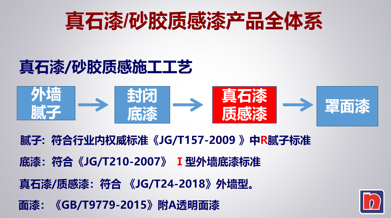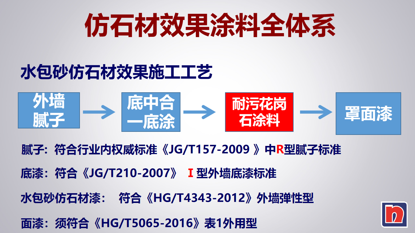 基層前處理(基層含水小于10%,平整度編差小于3mm)——批刮外墻專(zhuān)用膩?zhàn)痈稍?、打磨、養(yǎng)護(hù)、干燥、點(diǎn)膩?zhàn)舆_(dá)到施工要求、點(diǎn)補(bǔ)修理、干燥、打磨——涂抗堿底漆或油性封閉底漆——打磨、保養(yǎng)——施涂面漆——清理現(xiàn)場(chǎng)